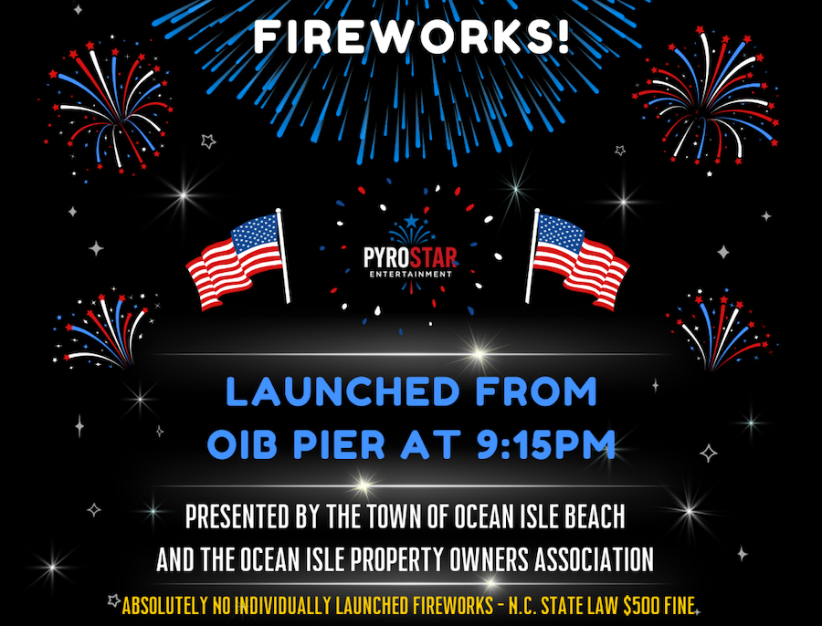 Let’s get ready to CELEBRATE! We are thrilled to have PyroStar Entertainment back for our Fireworks Celebration on Friday, July 4th, 2025 at approximately 9:15pm. This event is co-sponsored by the Ocean Isle Property Owners Association and the Town of Ocean Isle Beach.
